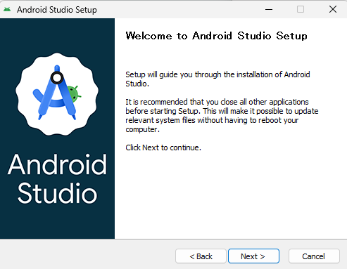 - ダウンロードした「android-studio-2025.2.2.8-windows.exe」をダブルクリックすると、次の画面が表示されます。