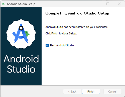 - 「Finish」をクリックします。Android Studioが起動します。インストールは完了です。