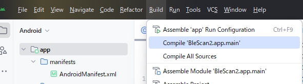 作成したプログラムをビルドするには、次のように上部メニューの Build > compile ‘xxxxxx’ を選択します。