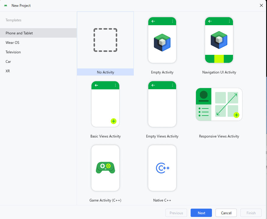 - Android Studioで「No Activity」を選択します。