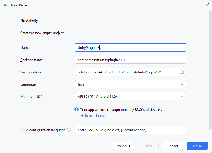Android Studioによりネイティブプラグインを作成し、Unityに作成したネイティブプラグインを実装し、新規プロジェクトを作成して、Android携帯にネイティブプラグインとゲームオブジェクトを転送して実行します。このブログは「Unityで使用するAndroidのネイティブプラグインの作成(2026/01/16) – Unity編」に続きます。古いバージョンでのネイティブプラグインの作成は、「Unityで使用するAndroidのネイティブプラグインの作成(2024/01/06) – Android編」に示します。