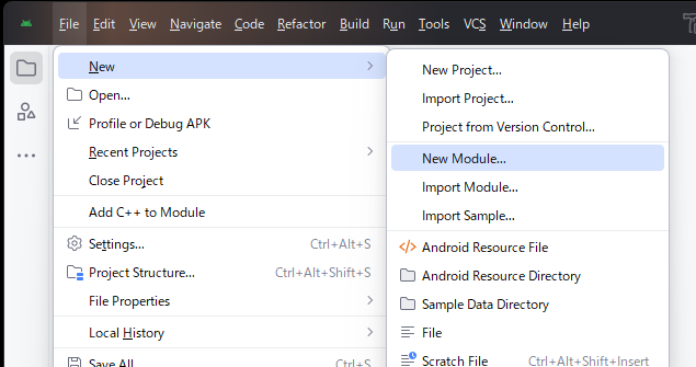 - 作成した新規プロジェクト「UnityPlugin2601」を選択して、File メニューから「 New 」→ 「New Module」を選択し、開いたダイアログで「Android Library」を選択します。