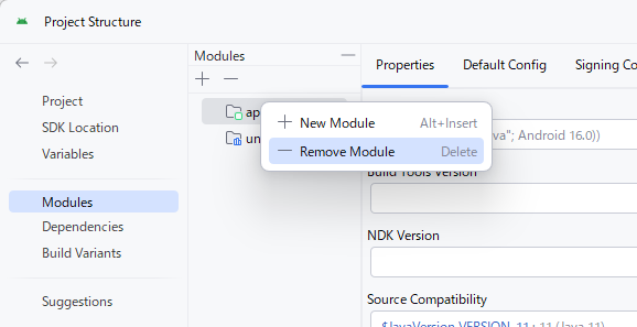 - 開いたダイアログの左メニュー「Modules」を選択して、最初に作られた「app」を削除します。
