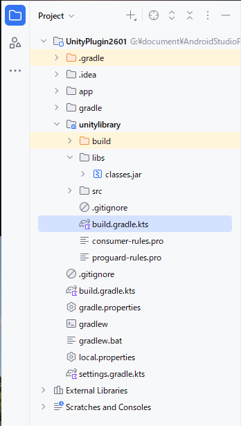 - モジュールレベル「unitylibrary」のbuild.gradle.ktsを次のようになります。