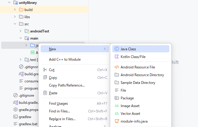 Android Studioにより次の手順でネイティブプラグイン「unitylibrary-release.aar」を作成します。