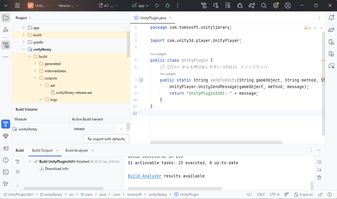 - ビルドが完了すると、次のように「・・・/UnityPlugin/unitylibrary/build/outputs/aar」にAARファイル「unitylibrary-release.aar」が生成されます。