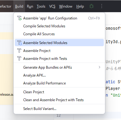 Android Studio Flamingo では「Make Module ‘UnityPlugin2401.unitylibrary.main’」になっていましたが、「Assemble Selected Modules」になっています。これは、新しいUI「IntelliJ New UI」やGradleの仕様変更に伴うため。