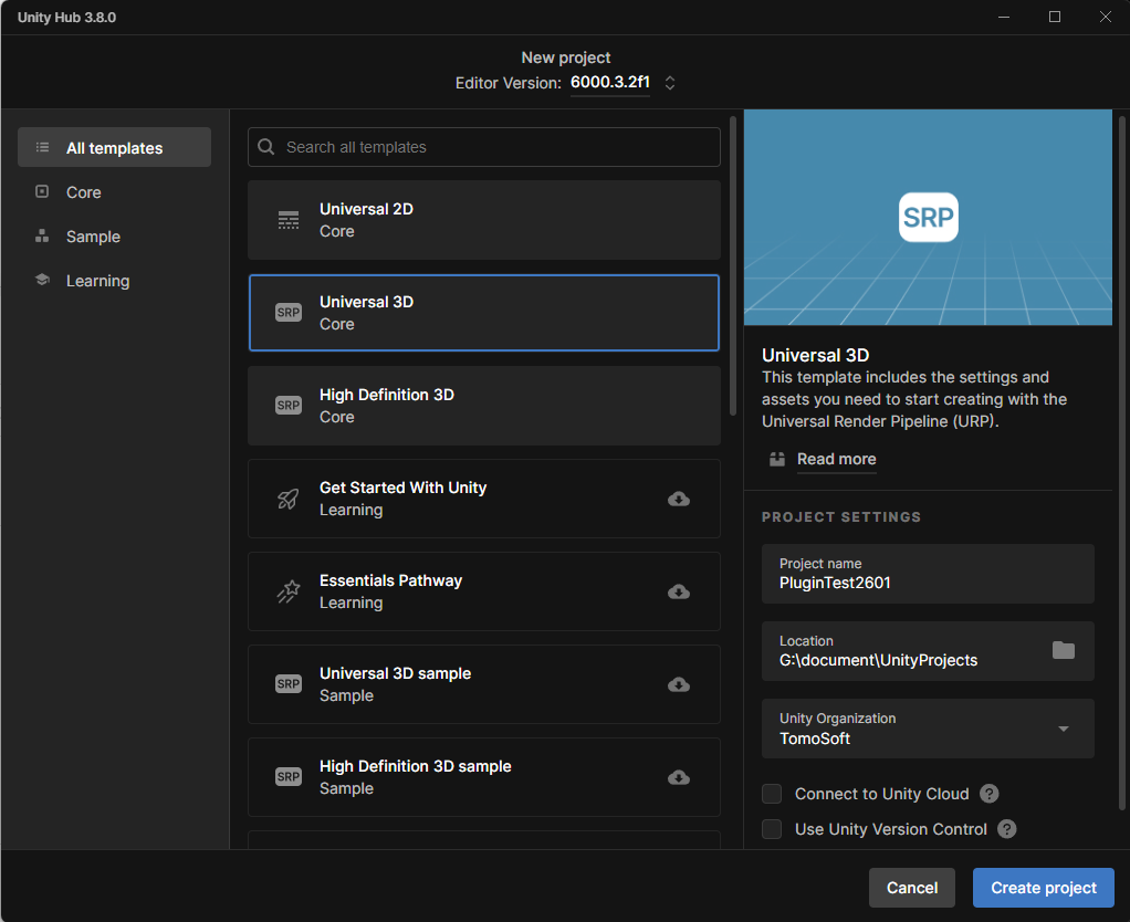 - Unity Hubで、つぎのように設定し、新規プロジェクト「PluginTest2601」を作成します。
