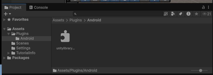 - Unityエディタでにフォルダ「Assets/Plugins/Android」を作成し、作成したネイティブプラグイン「unitylibrary-release.aar」をドラッグ&ドロップします。