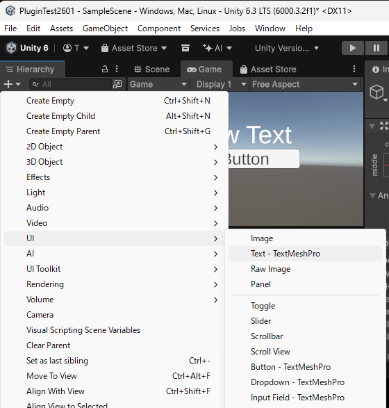 - Hierarchyタブの「+」→「 UI」からText、Buttonを作成します。