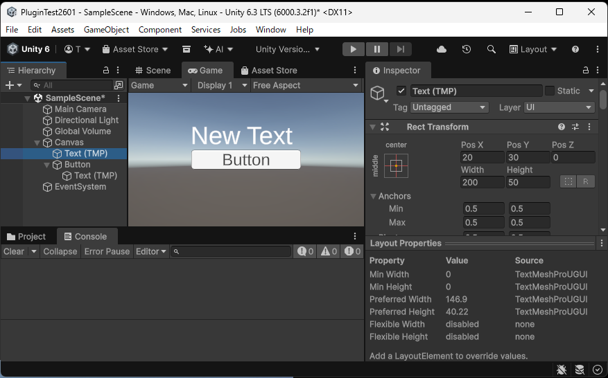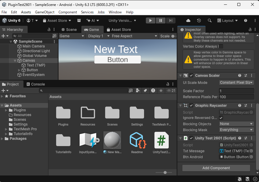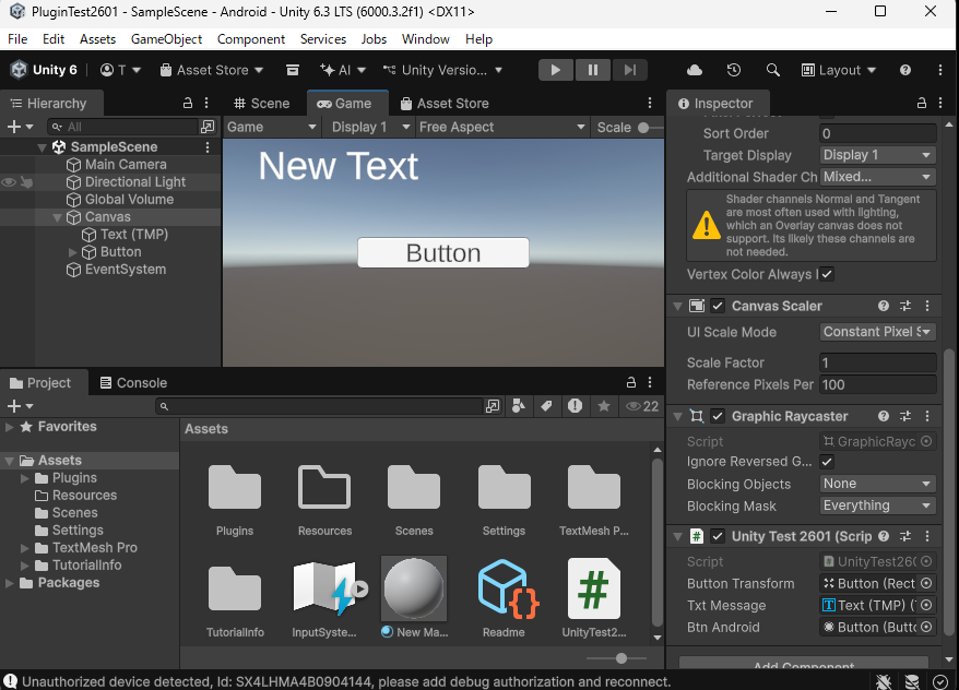 新規プロジェクト「PluginTest2601」を作成してネイティブプラグイン「unitylibrary-release.aar」を実装して、Android携帯にゲームオブジェクトを転送して実行します。