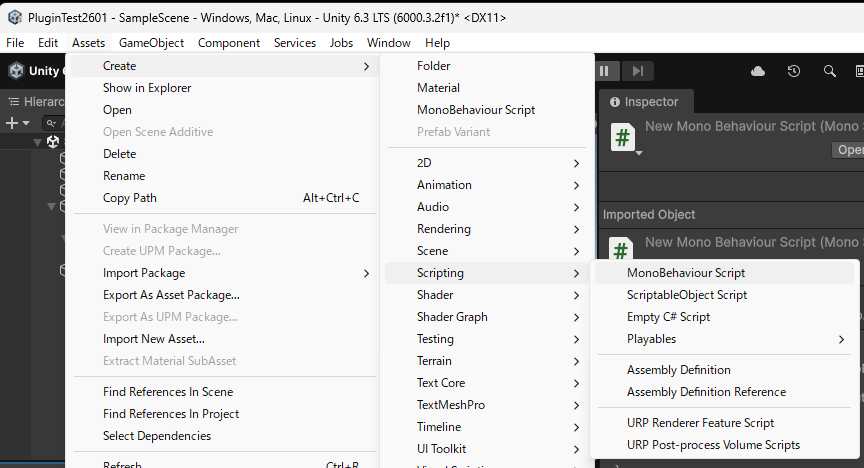 - Assetsメニューから「Create」→「Scripting」→「Monobehaviour Script」を選択して、次に示すスクリプト「UnityTest2601.cs」を作成します。