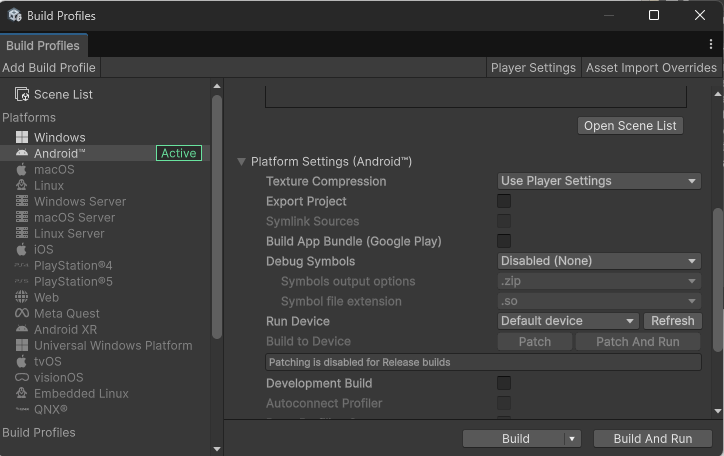 - Fileメニューから「Build Profiles」を選択します。表示された「Build Profiles」画面で「Android」を選択して「Switch Platform」ボタンをクリックします。