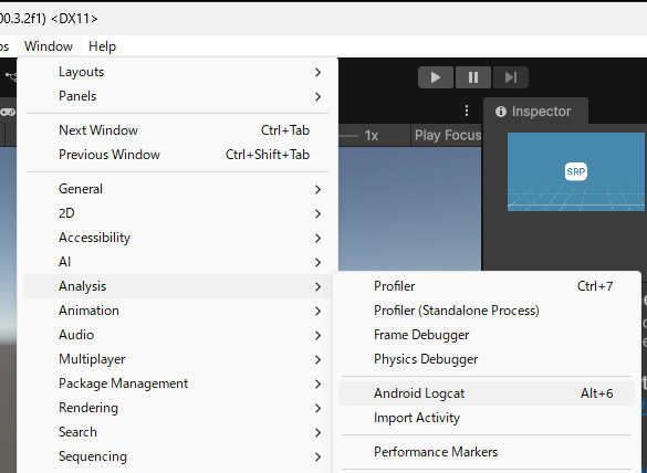 Unityエディタ内に専用のウィンドウを表示させるために、上部メニューの Window > Analysis > Android Logcat を選択します。