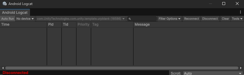 Android実機のログ(Debug.Log や Java側の Log.d)を確認するために、Unityエディタに内蔵されている Android Logcatパッケージを使用します。