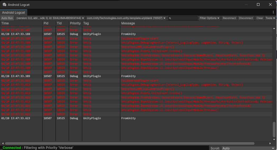 - Search (Filter): 検索窓に「Unity 」 と入力すると、C#の Debug.Log だけを抽出できます。Java側で独自のタグを付けている場合は、そのタグ名で検索します。