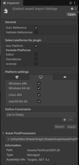 Unity 上で DLL ファイルを選択し、以下の設定を行います。