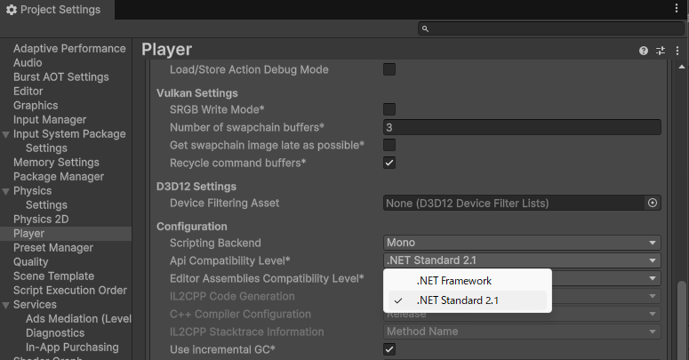 表示されたダイアログで、「Player」→「Configuration」→「Api Compatibility Le..」を選択して、「.NET Standard2.1 」を選択します。