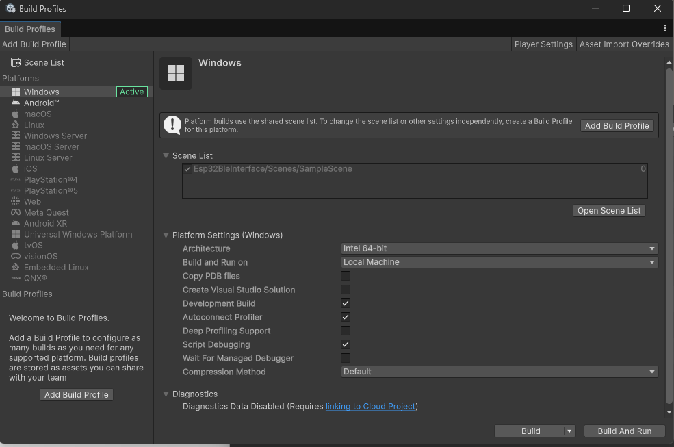 File > Build Profiles を開き、次のようにDevelopment Build と Script Debugging にチェックを入れてビルドします。Autoconnect Profiler( CPUの負荷、メモリ消費量、GPUのボトルネックなどをリアルタイムでグラフ化) にもチェックを入れておくと、Unityエディタの Console ウィンドウと連携してリアルタイムでログを見ることができます。