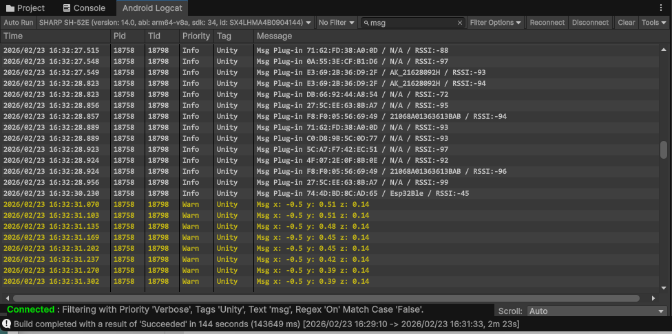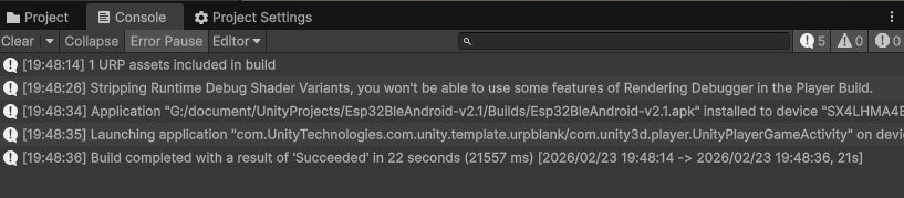 - You can track the status of the build and installation process in the Console tab. If successful, the game will automatically launch on your phone once the process finishes.