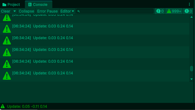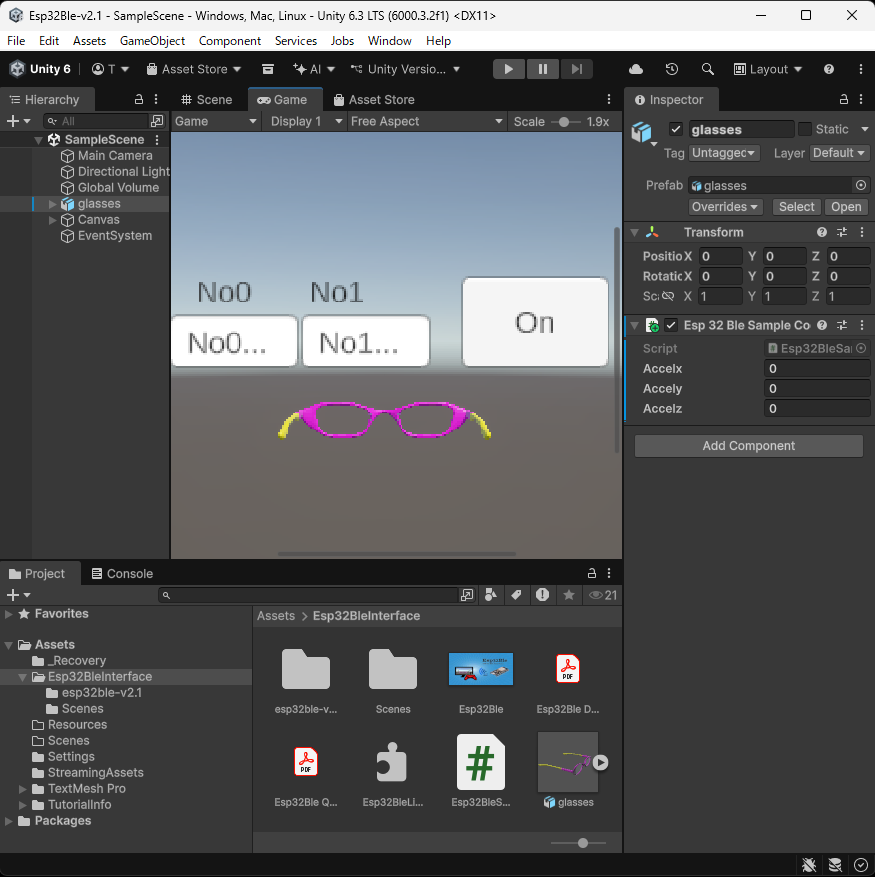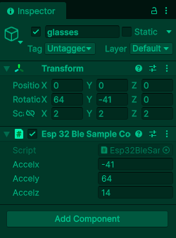 - Data from ESP32 to Unity: The ESP32 generates simulated acceleration data (x, y, z) using a SIN function and sends it to Unity. A 3D object ‘Glasses’ tilts in response to this data.